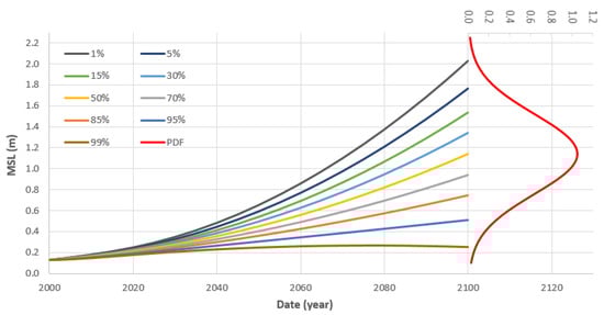 Relative SLR projections (in meters) for the 21st century of the WCPM, corresponding to a discrete set of percentiles, from 1 to 99% (probability of not being exceeded). The PDF curve is fitted to the MSL y-axis.