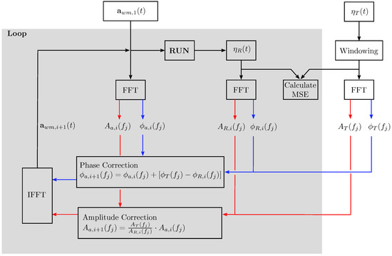 - Calculate the new amplitudes for each frequency component of the input source term, , by scaling the previous amplitudes, , with the ratio of target surface elevation amplitude, , and the generated surface elevation amplitude from the previous run, :