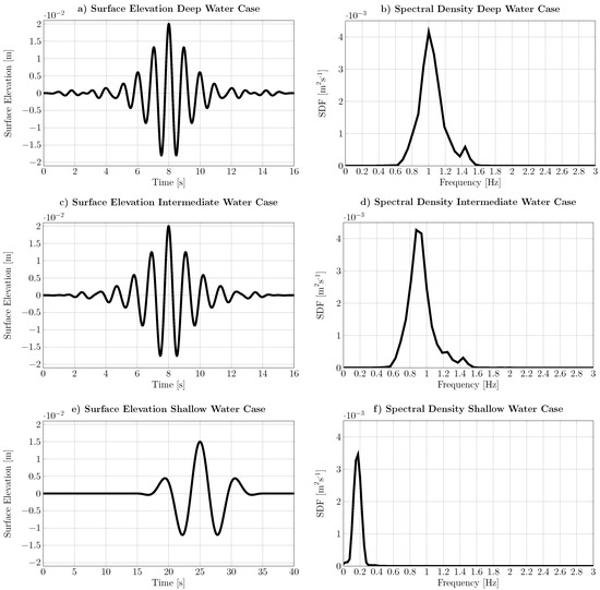 Although the parameters used in this case study were, to a certain extent, arbitrarily chosen, wave packets are generally well suited for testing the calibration of amplitudes and phases of different frequency components [32] and are also of practical relevance in industrial applications [33]. While for the deep and intermediate water case, the wavelength was kept constant, the water depth was equal for the deep and shallow water case. Choosing the parameters for the shallow water case requires care, in order to avoid breaking waves. Time traces for the surface elevation, , and plots of the spectral density, , are shown in Figure 2, for all three wave packets.