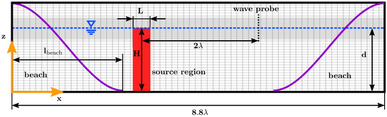 Schematic of the NWT including the main dimensions (schematic not at scale). The function of the gradual increase of in the numerical beach is included in purple. The source region is marked in red. The spatial discretisation, with a fine resolution around the free surface interface, is shown in the background. For the shallow water cases, the water depth d is set to for the intermediate water case to and for the deep water case to .
