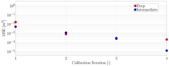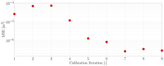Figure 4 displays an example of the typical decrease in MSE for increasing calibration iterations during an experiment. Note that the evolution is non-monotonic, which is explained by Figure 5, showing the corresponding surface elevation time traces from a selection of these calibration iterations. The first iteration was initialised with random input of small amplitude, and the resulting surface elevation was almost zero, while the MSE of was large. Obviously, convergence could be improved by choosing better initial values, but even for random noise as start values, this behaviour has been observed as typical for all cases. The second iteration yielded several waves with similar amplitude and frequency to the target wave packet, but out of phase, and the resulting MSE almost doubled. The fourth and fifth iterations decreased the MSE by orders of magnitude to and . The main peak of the wave packet was now already correctly resolved, and most of the error stemmed from some small high frequency waves after 11 . Further iterations decreased the MSE to about , and agreement was now further improved for the small ripples after 11 . For all the results presented Section 4.2, Section 4.3 and Section 4.4, nine calibration iterations were used.