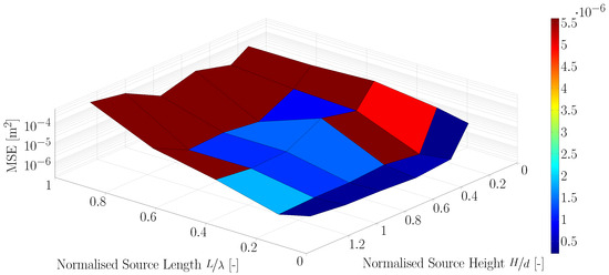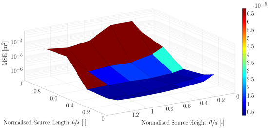 MSE values for different source heights and lengths, intermediate water case. Centre at .