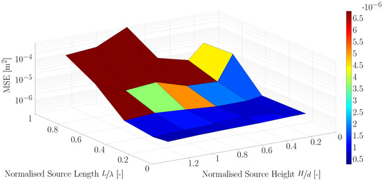The performance of the various source region layouts was evaluated as the MSE between the target surface elevation, and the achieved result, :