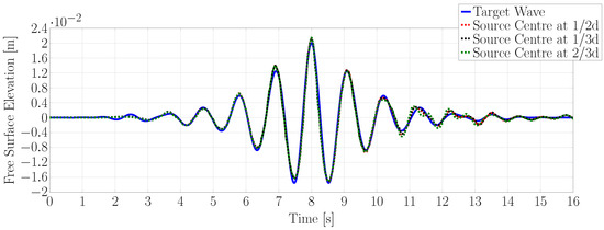 In this section, a case study is presented with two main objectives: firstly, to demonstrate the capabilities of the impulse wavemaker and the self-calibration procedure in producing realistic deep, intermediate or shallow water wave series, at a specified location in a wave tank. The second objective is to provide guidance on the selection of the wavemaker source region, by investigating the effect that the size and position of the source region has on the resulting waves. It might be expected that a very long source area will decrease accuracy, whereas a very short source region will require very large velocity components to create a target wave. For the shallow water impulse wavemaker presented by Choi and Yoon [18], a source length of about a quarter to half a wavelength is recommended. In shallow water, the entire water column, from the sea floor up to the water surface, performs an oscillating motion, whereas in deep water, only part of the water column is affected, and the wave motion does not extend to the sea floor. It is thus an interesting question how to choose the length and depth of the source region to achieve optimal results.