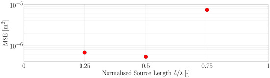 To investigate the influence of the size and location of the source region, 120 multi-frequency wave packet experiments were run, for 90 intermediate depth cases and 30 deep water cases, with varying source region layouts. For the intermediate water cases, simulations were run with the source region progressively centred at a third, a half, and two thirds of the water depth. For deep water cases, the centre of the source region was located at a depth of , or half the water depth. For each different source centre location, 30 experiments were run with varying the source length region, L, of and varying the height of the source region, H, of and . For brevity, the parametric study on the source region size and location has only been performed for the deep and intermediate water depth case. Since the results were delivered in a parametrised form, as functions of the wave characteristics, the optimal setting found for the deep and intermediate water depth case can directly be applied to the shallow water case.