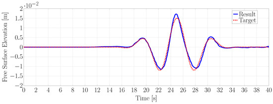 To demonstrate the ability of the impulse wavemaker, the case study created a unidirectional multi-frequency wave packet at a specified location in the NWT. The wave packet considered was a realisation of the NewWave formulation as presented by Ning et al. [31]. A NewWave wave packet comprises a summation of all the frequency components of a given spectrum, such that the largest amplitude wave crest is created in the temporal centre of the packet. The governing equations for the surface elevation, , and amplitude of each wave component, , with , are given in Equations (4) and (5), respectively: