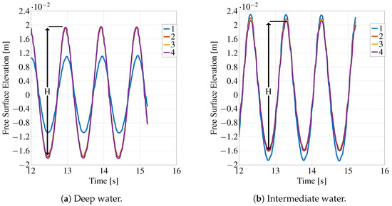 Two cases demonstrating the creation of regular waves in intermediate and deep water are presented. The target wave height was set to m and the period to s for the shallow water case and s for the deep water case, replicating the peak frequency and maximum wave height of the corresponding wave packets described in Section 3.1.1. If not mentioned specifically, the settings, found to be suitable for the corresponding wave packets, have been used for the setup of these regular wave cases.