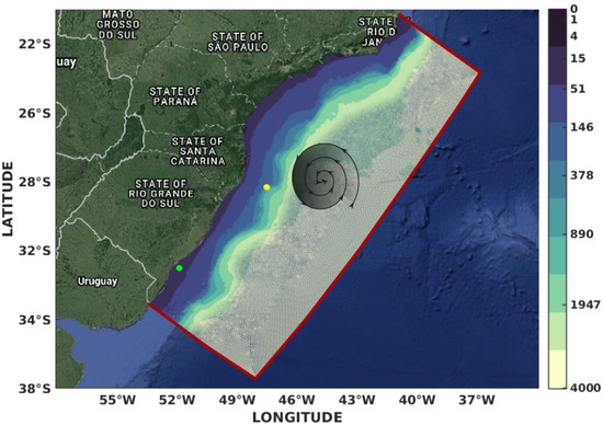Study area located in the South-Southeastern Brazilian Shelf. The red lines represent the oceanic liquid boundaries and the spiral represents the atmospheric surface conditions. The green dot represents the initial position of the ship. The yellow dot represents the in situ data from buoy PNBOIA-SC. Bathymetry is shown in the color bar.