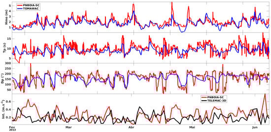 Time series of spectral significant wave heights (m), peak period (s) peak direction (°) from TOMAWAC (blue), and velocity intensity (m·) from TELEMAC-3D (black), compared against the observed data from the Santa Catarina PNBOIA buoy (red).