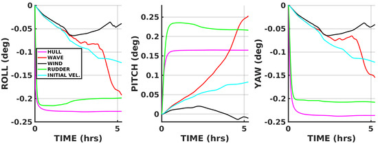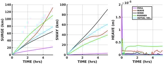 When it is stated that there were more variations or instability, it means the ship had more variations during the 5 h of simulation—it does not mean the difference between the initial and the final value. It can be understood that in the cases where the hull and the rudder were studied, the ship reaches some stability near to the first hour and in the other cases, the angular movements vary during all simulation periods.