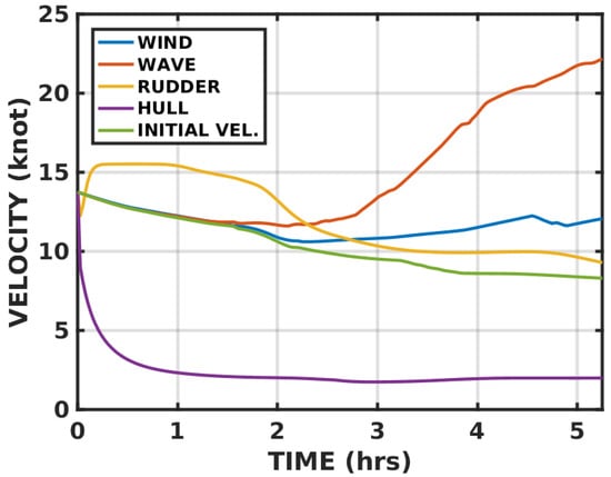 The timeline of ship’s velocity in each case can be seen in Figure 5.
