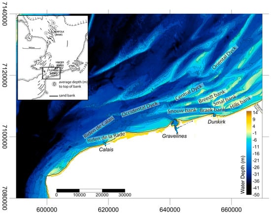 Tidal sand banks occur in a wide range of water depths all around the North Sea (Figure 1, inset). The UK and Belgian coastal zones have been intensively studied by using historical bathymetric charts. These investigations have revealed that off the Belgian coast, offshore sand banks such as the Hinder banks (Figure 1 inset) experienced only relatively small displacements [], which was confirmed by recent detailed multi-beam imagery []. Closer to the shore, the Middelkerke bank and the Kwinte bank (Flemish Banks—Figure 1 inset) have also remained relatively stable over the last decades [,,], suggesting a long-term dynamic equilibrium. Van Lancker et al. [] also showed that the Belgian coastal sand banks have only been affected by minor landward movements during the last 150 years. But these authors did not consider this landward migration as being significant, due to uncertainties in both position and water depth. On the contrary, the landward migration of nearshore sand banks was particularly common along the North Sea coast of France, where onshore movements are generally significant. Historical bathymetric maps have also been used to analyze the evolution and dynamics of the Norfolk banks, off the East Anglian coast (Figure 1, inset), and revealed major displacements parallel to the coastline []. Using a hydrodynamic model and bathymetric charts from 1848 to 2000, Horrillo-Caraballo and Reeve [] concluded that the observed changes in the morphology of the Norfolk sand bank were strongly linked to the pattern of tidal residual currents.
