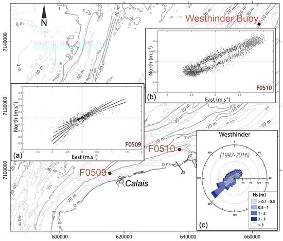 Location map of the current meters (Shom) and offshore wave buoy (map projection: Lambert 93); (a,b): Directional distribution of the mean currents recorded in 5 m water depths on the shoreface at Calais and Dunkirk (F0509: from 25 April 1975 to 13 May 1975; F0510: from 5 July 1978 to 19 July 1978) (©Shom); (c): wave rose at the Westhinder buoy (from []).