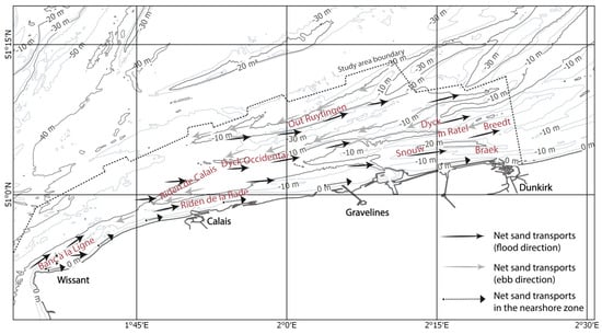The tidal regime in this area is semi-diurnal and macrotidal, with a tidal range increasing from the north-east to the south-west (the mean spring tidal range is approximately 5.4 m at Dunkirk and 6.5 m at Calais []). Tidal currents are alternating in the coastal zone, flowing almost parallel to the shoreline and oriented toward the east-northeast during flood, and toward the west-southwest during ebb (Figure 2a,b). Due to a large tidal range, tidal currents are strong, reaching a maximum near-surface velocity of 1.5 m·s−1 during ebb and 1.8 m·s−1 during flood []. Current velocity generally diminishes eastward, due to the decreasing tidal amplitude in the same direction (Figure 2a,b). Flood current velocities exceed those of the ebb in various sectors of the coastal zone (Figure 2b), resulting in a flood-dominated asymmetry that is responsible for a net regional sediment transport to the east-northeast []. Locally, numerous sand banks can modify the bottom circulation and result in opposite transport directions on both sides of the banks (Figure 3) [,].