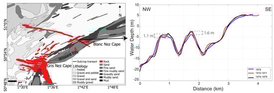Left: Seabed sediment distribution map of Wissant bay (© Shom), with the location of the cross-shore profile shown in right-hand figure. Right: Superimposition of bathymetric profiles recorded at different periods (1879, 1910–1911, and 1974–1976) over a rocky outcrop.