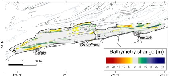 - The offshore area between Calais and Gravelines, where the Dyck bank experienced a lowering of its seaward side, whereas the landward side of the bank recorded a vertical accretion of 20 m during this period, due to a shift in position.