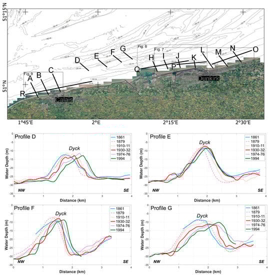 The Dyck bank is a 60 km long offshore sand bank, located 10 km off the coast and divided between the Occidental Dyck, the Central Dyck, and the Oriental Dyck. The Occidental and Central Dycks are almost parallel to the shoreline, with a height reaching 25 m above the surrounding sea floor and a crest lying at depths of about −10 m. The oldest hydrographic field sheets cover only the western part of the bank (i.e., the Occidental Dyck). Therefore, the results presented here have only been obtained for this part of this bank, and for the sake of clarity, the Occidental Dyck is simply called the Dyck bank in the paper.