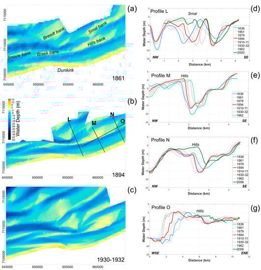 (a–c): Nearshore bathymetry offshore of Dunkirk in 1861, 1894, and 1930–1932 (map projection: Lambert 93). (d–g): Bathymetry profile evolution across the Hills and Smal banks between 1836 and 2006. L, M, N are the cross-shore profiles, and O is a longshore profile.