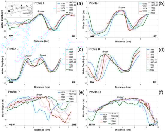 Bathymetry profiles evolution across the Braek and Snouw banks from 1836 to 2000. (a–d) are cross-shore profiles H, I, J, K; (e,f) are longshore profiles P & Q (see Figure 6 for the location of profiles).