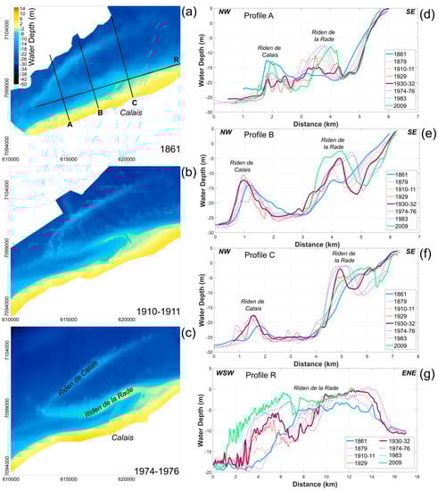 (a–c) Nearshore bathymetry offshore of Calais area in 1861, 1910–1911, and 1974–1976 (map projection: Lambert 93). (d–g): Bathymetry profiles evolution from 1861 to 2009; A, B and C are cross-shore profiles and R is a longshore profile.