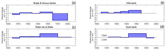Volume change of the Hills, Braek and Snouw, Dyck banks, and of the Riden de la Rade, were computed between successive surveys (Figure 10). As previously explained, the Riden de la Rade experienced growth during the 20th century. Volume change computations show that the bank underwent sediment accumulation since the end of the 19th century, and maximum accumulation was recorded between 1930 and 1975, with a gain of +1.79 × 107 m3 (Figure 10c). The Hills bank also showed an overall positive volume change since the 19th century, with a minimum accumulation of 8.37 × 105 m3 between 1879 and 1894, and an increase in sediment volume reaching +1.45 × 107 m3 between 1930 and 1962 (Figure 10b). These results clearly show that the Riden de la Rade and the Hills banks acted as sediment sinks during the 20th century.