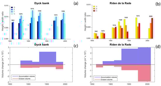 Changes in height/width ratio computed on perpendicular transects across (a) the Dyck bank and (b) across the Riden de la Rade (see Figure 6 for location of transects); sediment volume change (erosion/accumulation) of the (c) Dyck bank and of the (d) Riden de la Rade.