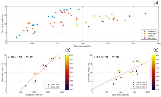 Figure 12b,c show the change in time of both the heights and the widths of the Braek and the Snouw sand banks. The relationship between bank width and height is statistically significant for both banks, but especially for the Break bank (R2 = 0.91). The Break bank evolution also highlights that both the height and the width increased with time. This is consistent with our previous observations based on cross-shore profiles, which showed the lateral and vertical development of this bank occurred since the early 19th century (Figure 8, Profile K). For the Snouw bank, the temporal evolution was more complex, with an increase of both the height and width at its easternmost part, but a decrease in its width at its westernmost part, while its height remained relatively stable. This may be related to the longshore migration of this bank towards the northeast.