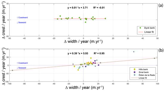 Having noted that bank width and height generally show a good correlation between each other, we attempted to evaluate the possible changes in bank morphology with bank migration. To do so, the annual rate of change in the width of several sand banks (∆ width/year) was plotted against the rate of change of the bank crest position (∆ crest/year), as measured on individual transects. Figure 13b displays the results obtained for the three nearshore banks (Riden de la Rade, Hills and Smal banks), and Figure 13a for a sand bank located further offshore (Dyck bank). The Braek and Snouw banks were not considered in this analysis, due to their minor cross-shore movements in comparison to the other banks.
