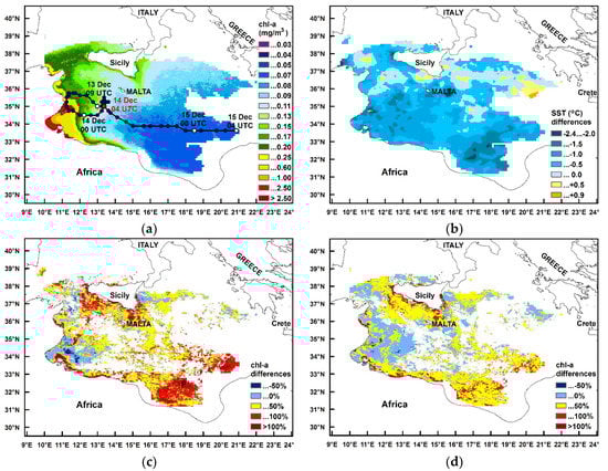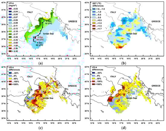(a) The study area together with the mean 1998–2016 chlorophyll-a concentration for December and the medicane’s track. Day and hour refer to the white dots while the red dot denotes the minimum pressure; (b) SST differences between 1 and 7 December 2008; (c) Chlorophyll percentage differences between the maximum concentrations of 5 days after the event (5–9 December 2008) and 5 days before (28 November–2 December 2008), P denotes the area of large chlorophyll increase referred in the text; (d) Same as (c) for the 5 days after the event and 1998–2016 December climatology.