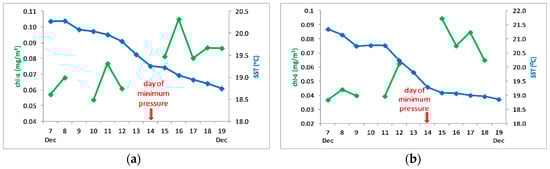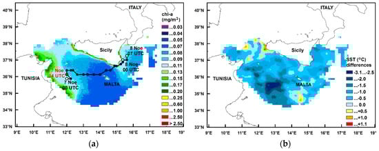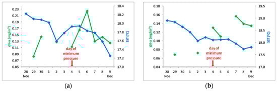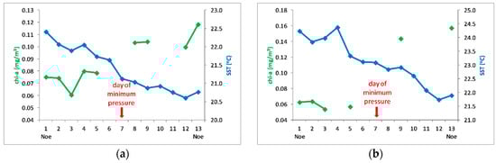 Over the 50 km width area along the cyclone’s track on 7 December and for the P area of Figure 5c that presented a significant chlorophyll increase, mean values were computed for chl-a and SST on a daily basis for the time period 1–13 November. Over the along-track area (Figure 6a) SST decreased by 1.8 °C and chl-a increased by 47.5%; the P area (Figure 6b) presented a decrease of 2.5 °C in SST and a chl-a increase of 145%. In this case also, the SST drop began before the main day of the event and continued a few days after it; chlorophyll increased during and after the event.
