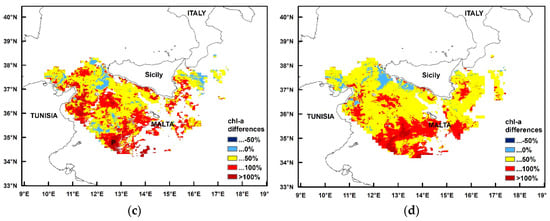 The chlorophyll differences between the week after the event (9–16 November 2014) and the week of the event (1–8 November 2014) that are given in Figure A6a, revealed increases for 94.8% of the area. These increases were >50% for 41.3% of the data and >100% for 6.9%; the absolute percentage differences exceeding 50% referred to 41.3% of the data, and they were all increases. Comparing the chlorophyll concentrations of the week after the medicane with November climatology (Figure A6b), the values were higher for 95.5% of the area, with differences >50% for 18.8% of the data and >100% for 0.5%; the absolute percentage differences exceeding 50% referred to 18.8% of the area and they were all increases.