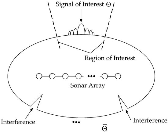 Consider a linear sonar array with omnidirectional elements receiving narrowband signals from far-field underwater targets (one desired signal and interferences). The depiction on the array signal model is shown in Figure 1. The th array snapshot vector can be modeled as: