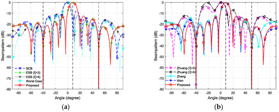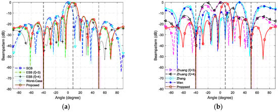 The resultant beampatterns for SNR = −15 dB. (a) The beampatterns of SCB, ESB, Worst-Case and the proposed beamformer; (b) The beampatterns of Zhuang’s, Zhang’s, Wen’s and the proposed beamformer.