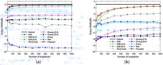 Output SINR versus the number of snapshots for: (a) SNR = 0 dB; and (b) SNR = −15 dB.
