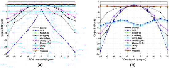 In this simulation, we generally adopt the parameter setting in the first simulation and vary the DOA of SOI from to . That is, the DOA mismatch varies from to . The results for SNR = 0 dB are depicted in Figure 7a, and the results for SNR = −15 dB are depicted in Figure 7b. The corresponding optimal SINRs at SNR = 0 dB and SNR = −15 dB are represented by the black bold lines. It is clearly illustrated that the ESB of and the proposed method outperform the other beamformers. While Zhang’s beamformer and Wen’s beamformer have sufficient capacity to provide robustness against large DOA mismatch when SNR = 0 dB, their performances degrade severely when SNR = −15 dB. The SCB is very sensitive to the DOA mismatch and it is more sensitive when the SNR is larger. The Worst-Case beamformer, the ESB of and Zhuang’s beamformer cannot provide robustness against a large DOA mismatch.
