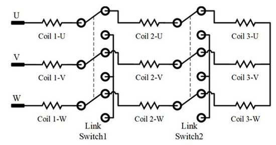 Connection between coils of each primary segment is shown in Figure 2. Coil 1 is the coils of primary segment I and coils 2 and 3 are the coils of primary segments II and III, respectively. When the power input increases, the order of coils cutting off is from 3 to 1. Each segment coil is connected to the rear segment coils or three phase Y, connecting the center point via a single-pole double-throw relay or power electronics. Since all primary segments share one secondary, there is no phase difference between coils 1, 2, and 3. Each segment coil can be directly connected in series.