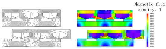By FEA, the magnetic flux density distribution is shown in the flux line and contour plot in Figure 6. The tooth magnetic density peak is approximately 1.8 T.