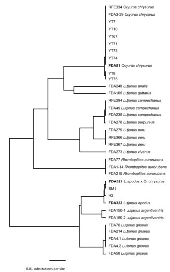 To confirm that these individual fish were hybrids, the mitochondrial and maternally derived CO1 gene was sequenced, along with the nuclear S7 gene, which is inherited from both parents. All samples were sequenced until 2× or greater coverage was achieved. All generated sequences have been deposited in Genbank, along with CO1 sequences used from the FDA reference sequence database (NCBI Accessions MK300530-MK300541 (S7) and MK297415-MK297439 (CO1), Supplementary Table S1, metadata for CO1 reference sequences can be found here: https://www.accessdata.fda.gov/scripts/fdcc/?set=seafood_barcode_data&sort=Scientific_Name_display&order=ASC&startrow=1&type=basic&search (accessed 12 June 2018)). The CO1 sequences generated an alignment that was 655 bases in length, which was then compared to the FDA Reference Standard Sequence Library for Seafood Identification (Figure 2). The two suspected hybrids (FDA321 and H2) matched the L. apodus vouchers with a 99.8% pairwise identity score. The yellowtail snapper individuals matched an O. chrysurus voucher with a 100% pairwise identity score. This indicates that the maternal species of both suspected hybrids was L. apodus.