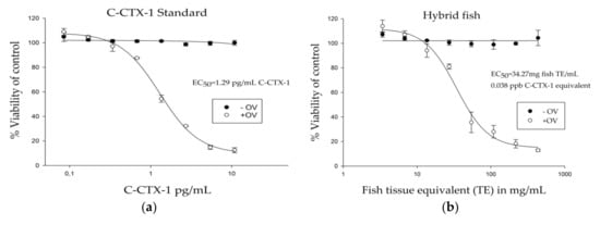 In vitro cell assay of (a) C-CTX-1 reference standard, the 8-pt concentration-response curve was applied starting at 10.9 pg/mL (EC50 = 1.29pg/mL), and (b) hybrid fish tissue extract, the 8-pt concentration-response curve was applied starting at 434.8 mg/mL (EC50 = 34.27 mg/mL). In addition to the samples, +OV wells received 20 µL ouabain and veratridine solution, −OV wells received 20 µL buffer solution (PBS).