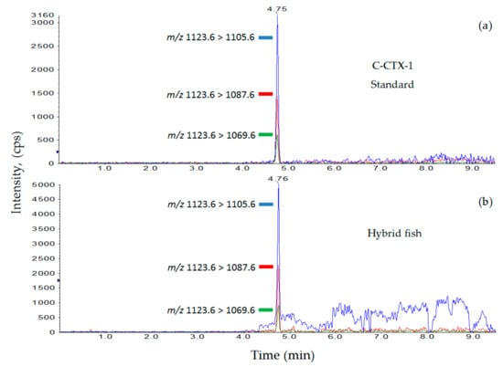 LC-MS/MS (MRM) chromatograms of C-CTX-1: (a) C-CTX-1 reference standard of 15 pg on column; (b) hybrid fish extract.