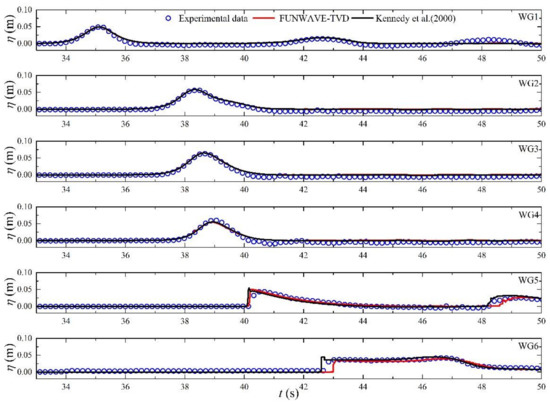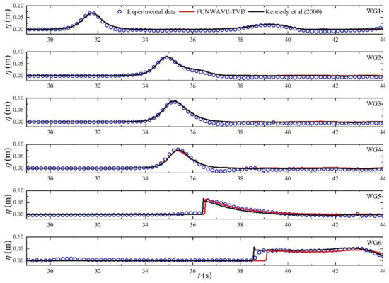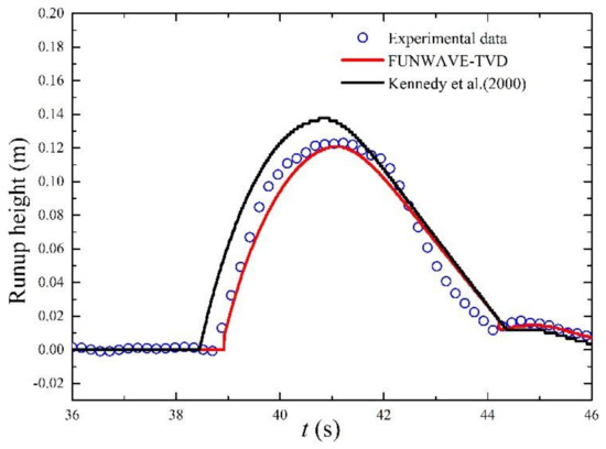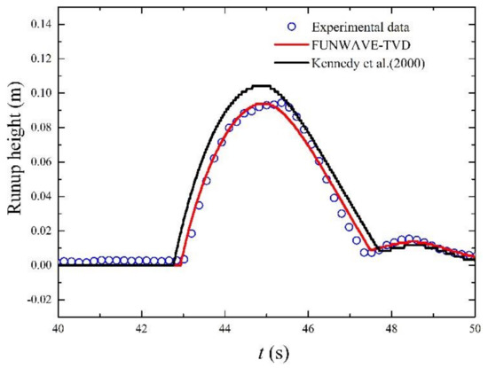 Figure 5 and Figure 6 show the comparisons of measured and predicted time series of run-up height. As seen in Figure 5 and Figure 6, the present model shows better predictive skills at the run-up gauge, in which case Kennedy et al. [29] slightly overestimated the maximum run-up height.