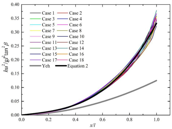 Figure 8 shows the dimensionless parameter hu2/gl2tan2β as a function of the parameter x/l for all cases listed in Table 1. As seen in Figure 8, the resulting distribution curves of all cases appear to form the envelope as well. With a curve fit, the envelope can be expressed by: