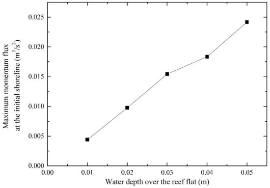 Figure 9 shows the simulated maximum momentum flux (hu2)max at the initial shoreline with the variation of the water depth over the reef flat for Cases 3–7. As seen in Figure 9, (hu2)max at the shoreline increased significantly with the increase of the water depth over the reef flat. The effect of the water depth over the reef flat on the maximum momentum flux at the initial shoreline is similar to the one on the run-up height, as presented in Ning [38] and Yao [23]. Larger water depth means, by nature, less bottom friction induced by the reef flat. Moreover, as revealed by Zhou [37], larger water depth also means less reflection by the fore-reef slope and less energy dissipation by the wave breaking for the solitary wave.