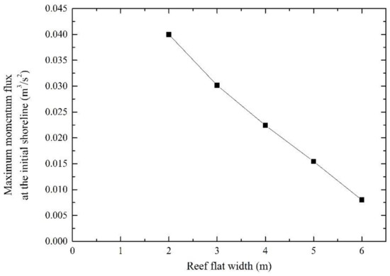 The state of a typical atoll or fringing reef is characterized by the fore-reef slope, reef flat width, and water depth over the reef flat. These parameters vary widely from place to place due to their variation in coral species, geology, and tidal conditions [46]. To better understand the role of fringing reefs in the mitigation of the tsunami hazard, numerical results of several cases in Table 1 were further analyzed to check the effects of these reef parameters on the maximum momentum flux at the initial shoreline.