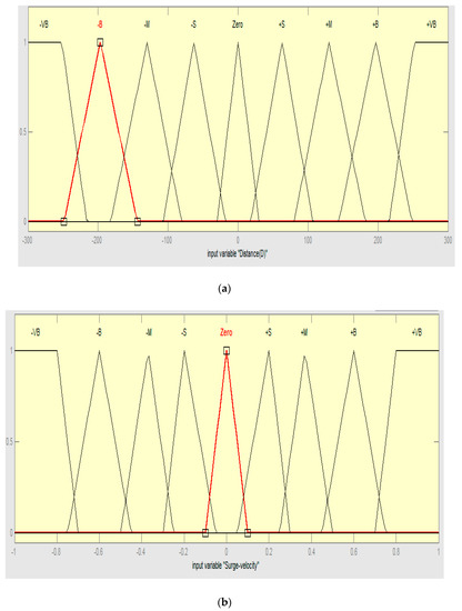 In this research, the distance to the normal of the wharf is limited in range (from −300 m–300 m). The surge velocity is from −1.0 m/s–1.0 m/s, and the output is determined from −1.0 rps to 1.0 rps. To implement the reasoning process of the controller, the rule base is supported as