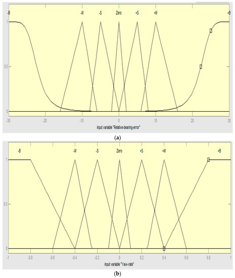 Figure 9. Seven membership functions in inputs and outputs are set to control the bow thruster and tugboat at the stern of the ship, which have linguistics variables such as: −B, −M, −S, Zero, +S, +M, +B. The rule base for this controller is shown as