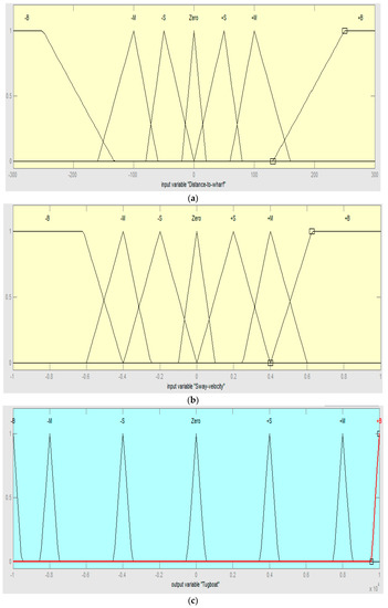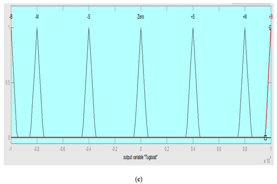 The distance to the wharf is from −300 m–300 m. The sway velocity is from −1.0 m/s–1.0 m/s, and the output is limited from −10000 N–0000 N. Similarly, the membership functions of tugboat and bow thruster forces contain seven triangle zones. Three zones at negative axis are used to push the stern of the ship from the starboard side to port one. The other ones at opposite axis are employed to pull the stern from portside to starboard side.
