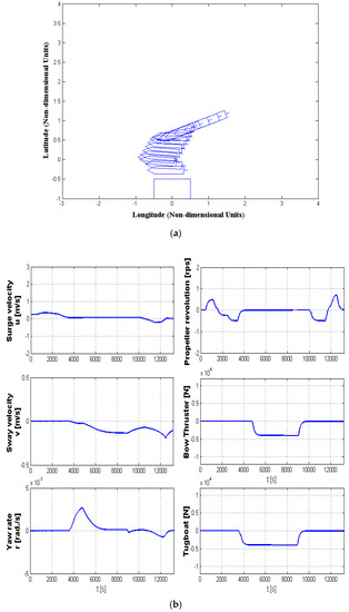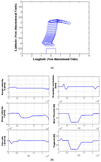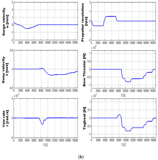 In the third case, the ship’s initial state is (−1.5, 1.5, 280, 0.25, 0, 0, 0, 0, 0, 0). The ship is on the left of the normal of the wharf at the starting point with 168 m in distance. The surge velocity is 0.25 m/s. In the first stage, the propeller revolution is rotated backward to make the ship’s movement to astern and then the ship is braked up by changing the rotation direction of the propeller. This action is done by the longitudinal movement controller to bring the ship toward normal of the wharf. In the second stage, the tugboat pulls the stern of the ship from port side to starboard side with 2000 (N) in force. Finally, the ship is brought into the wharf by forces from the bow thruster and the tugboat. Numerical results are shown in