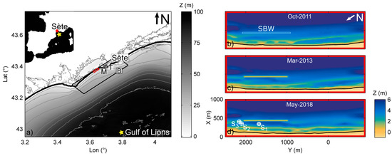 - Bouvier, C.; Balouin, Y.; Castelle, B. Nearshore bars and shoreline dynamics associated with the implementation of a submerged breakwater: Topo-bathymetric analysis and video assessment at the Lido of Sète beach. In Proceedings of the Coastal Dynamics, Helsingør Denmark, 12–16 June 2017; pp. 534–543. [Google Scholar]