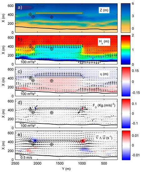 - Bruneau, N.; Bonneton, P.; Castelle, B.; Pedreros, R. Modeling rip current circulations and vorticity in a high-energy mesotidal-macrotidal environment. J. Geophys. Res. Ocean. 2011, 116, C07026. [Google Scholar] [CrossRef]